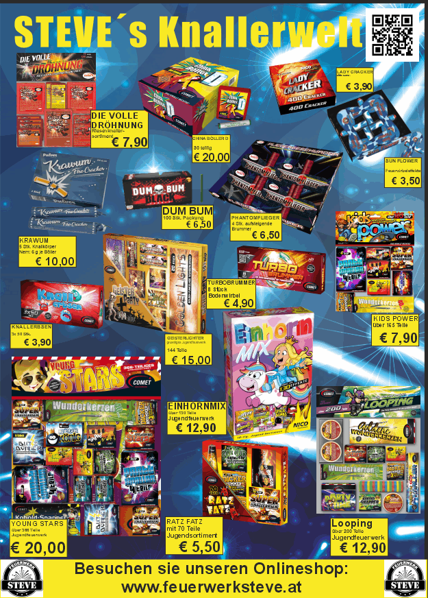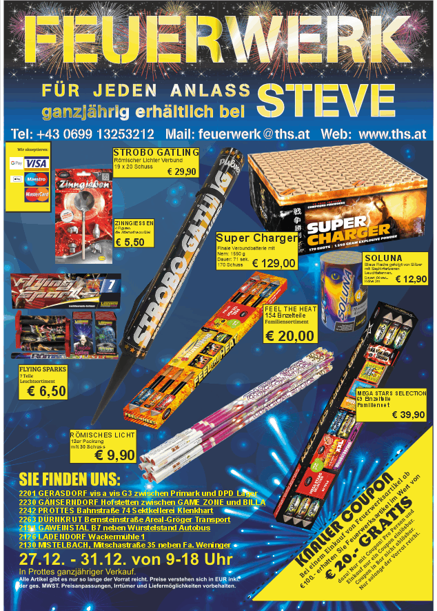 2126 Ladendorf können sie das ganze Jahr über Feuerwerk für Geburtstag, Hochzeit oder dergleichen erwerben. Bitte kontaktieren sie uns vorab unter 0699-132 532 12.