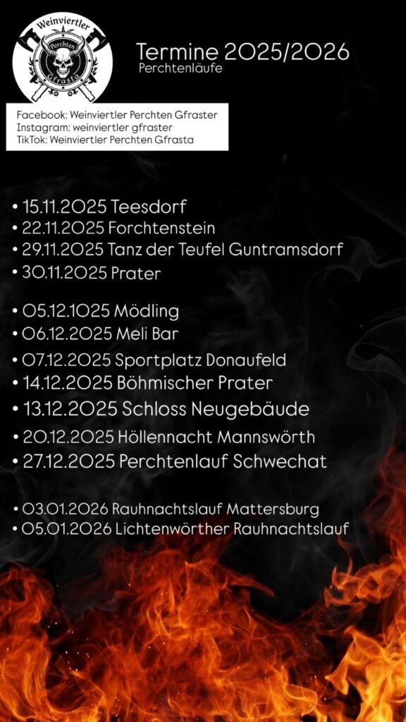 28. November Besuch am Punsch stand am SV Platz Groß Schweinbarth 29. November Lauf in Mistelbach 5. Dezember Räucherspaziergang im Ort 6. Dezember Lauf in Matzen 8. Dezember in Groß Schweinbarth im Mayerhof 19. Dezember Räucherspaziergang im Ort 3. Jänner 2026 Lauf in Leitzersdorf bei Stockerau